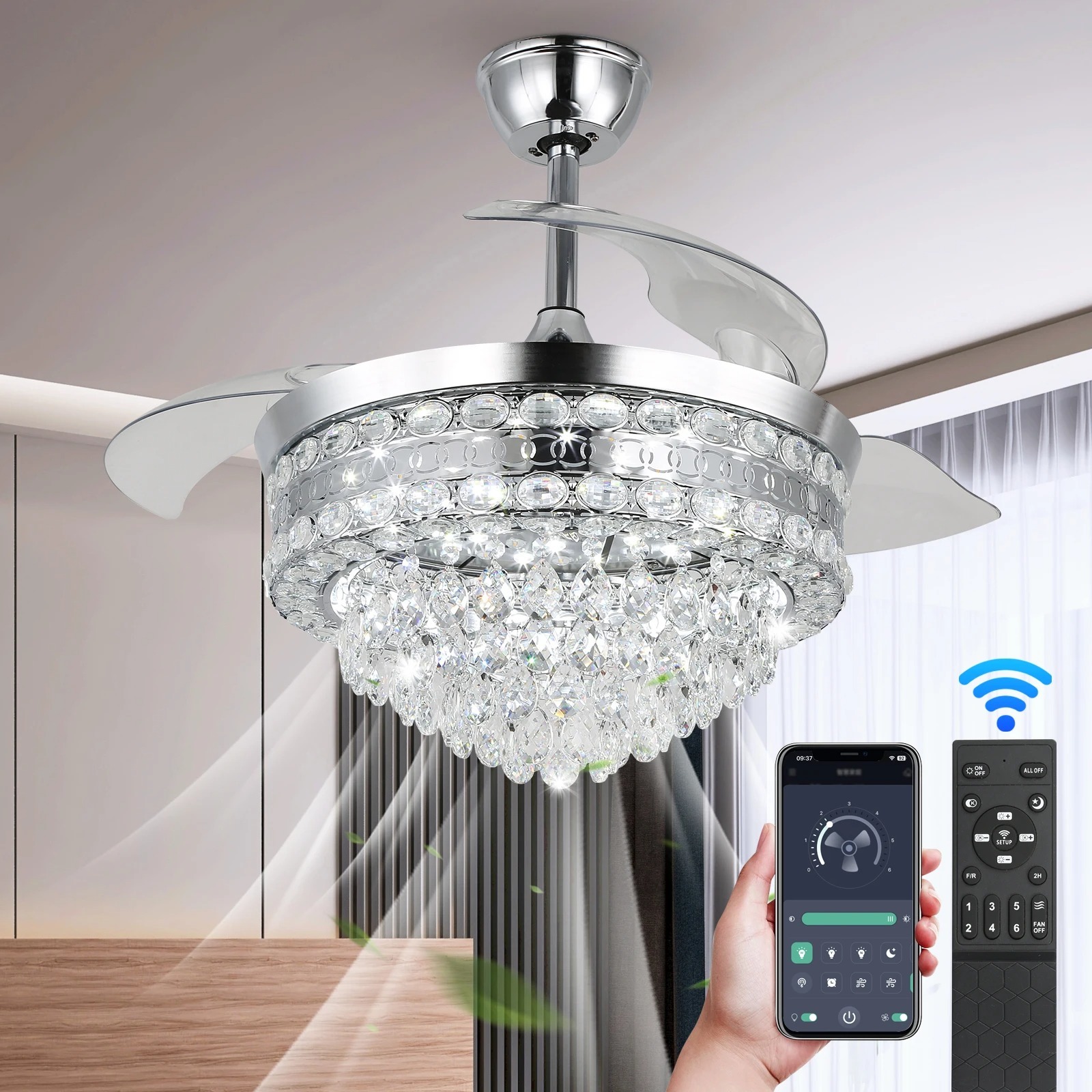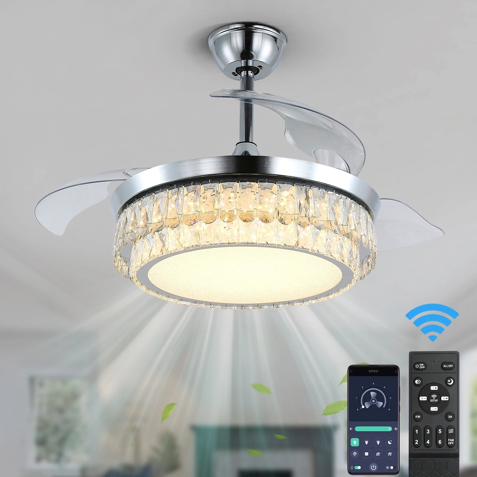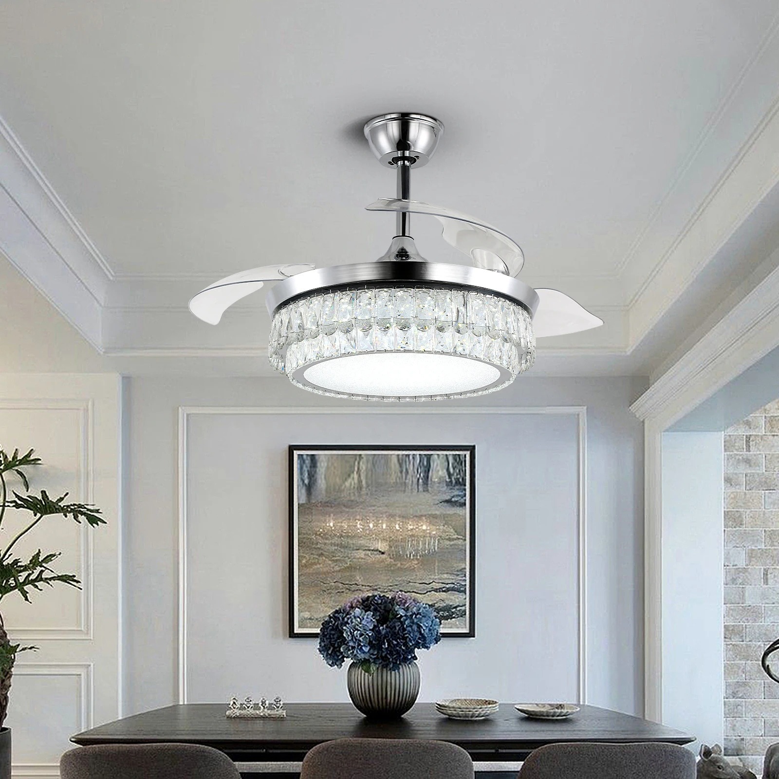 Led Light Retractable Chandelier Invisible Blade Dimmable Crystal Timing Fan lamp(WH-CLL-61)