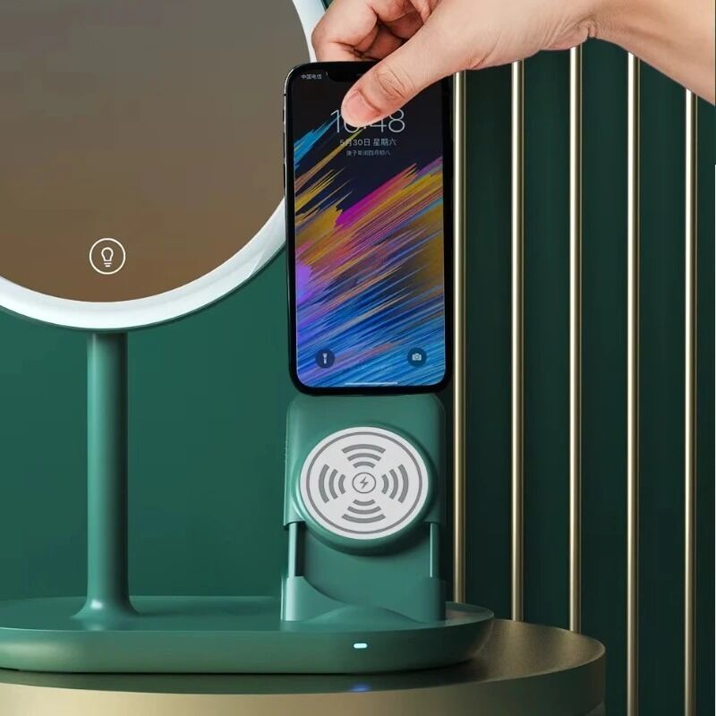 USB Rechargeable Vanity Mirror with Wireless Charger Portable 3 Colors LED Lights Makeup Mirror with lamp(WH-MR-99)